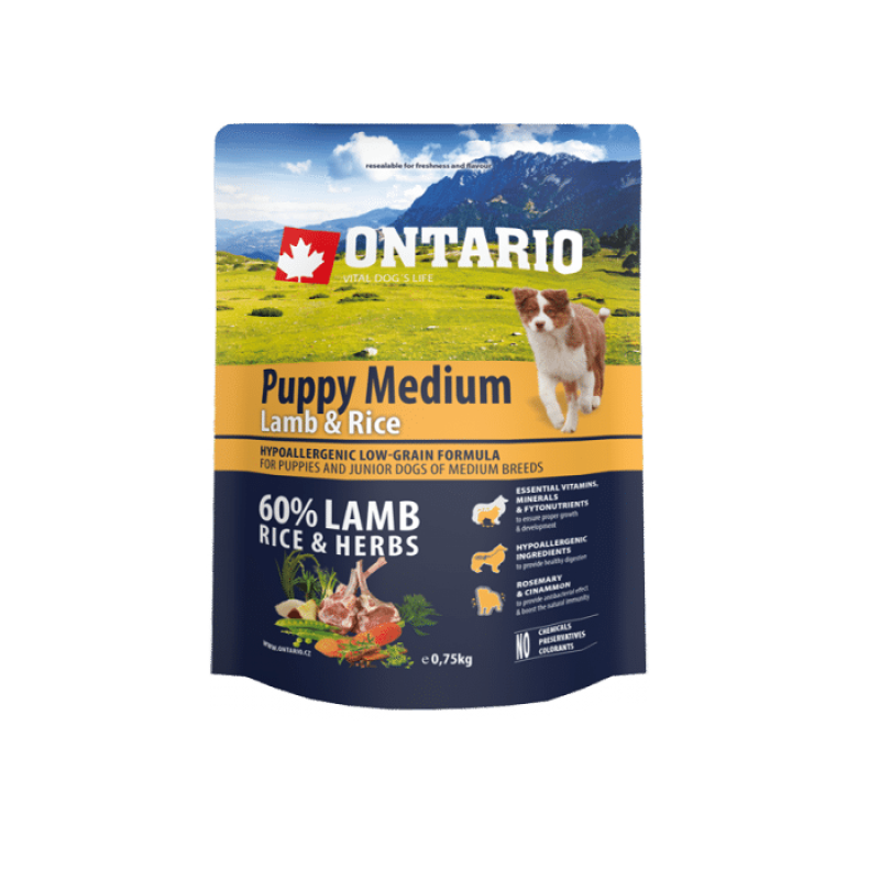 Barība suņiem – ONTARIO Puppy Medium Lamb and Rice, 0,75 kg. Pilnvērtīga sausā barība ar jēra gaļu un rīsiem vidēju šķirņu kucēniem vecumā no 1 mēneša līdz 1 gadam. Super Premium klases hipoalerģiska barība ar zemu graudaugu saturu, piemērota arī jutīgiem suņiem.