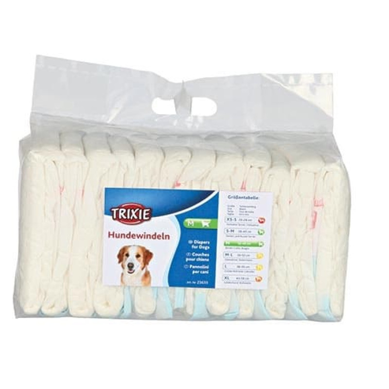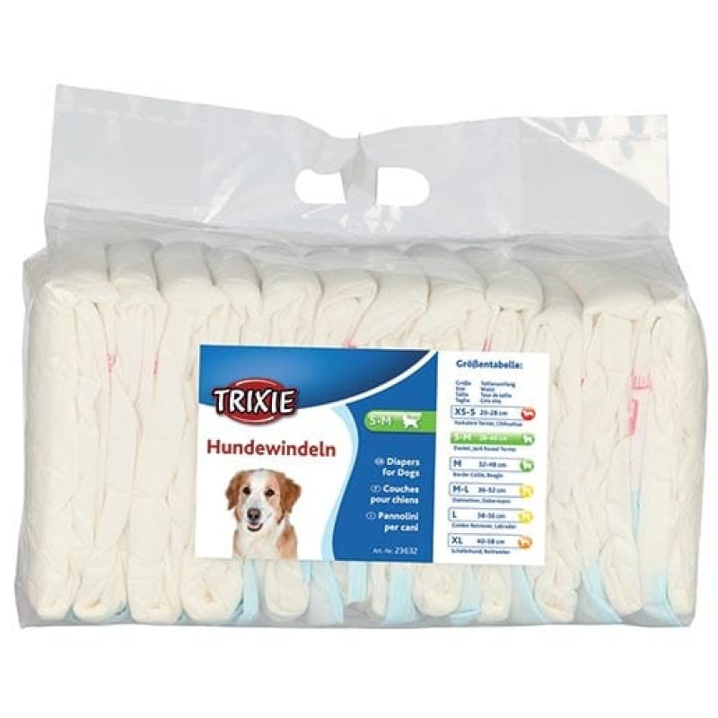 Autiņbiksītes - Trixie Diapers for dogs, 12 gab Trixie Autiņi kucēm, kas piemēroti nesaturēšanas laikā, pēc operācijas vai ceļojuma laikā, kā arī meklēšanās laikā. Autiņiem ir ir platas abpusējas fiksējošās lentes padara autiņus ērtus un ļauj dzīvniekam pārvietoties netraucēti. Labi absorbē smakas un mitrumu Vienreizējās lietošanas. Elastīga josta.